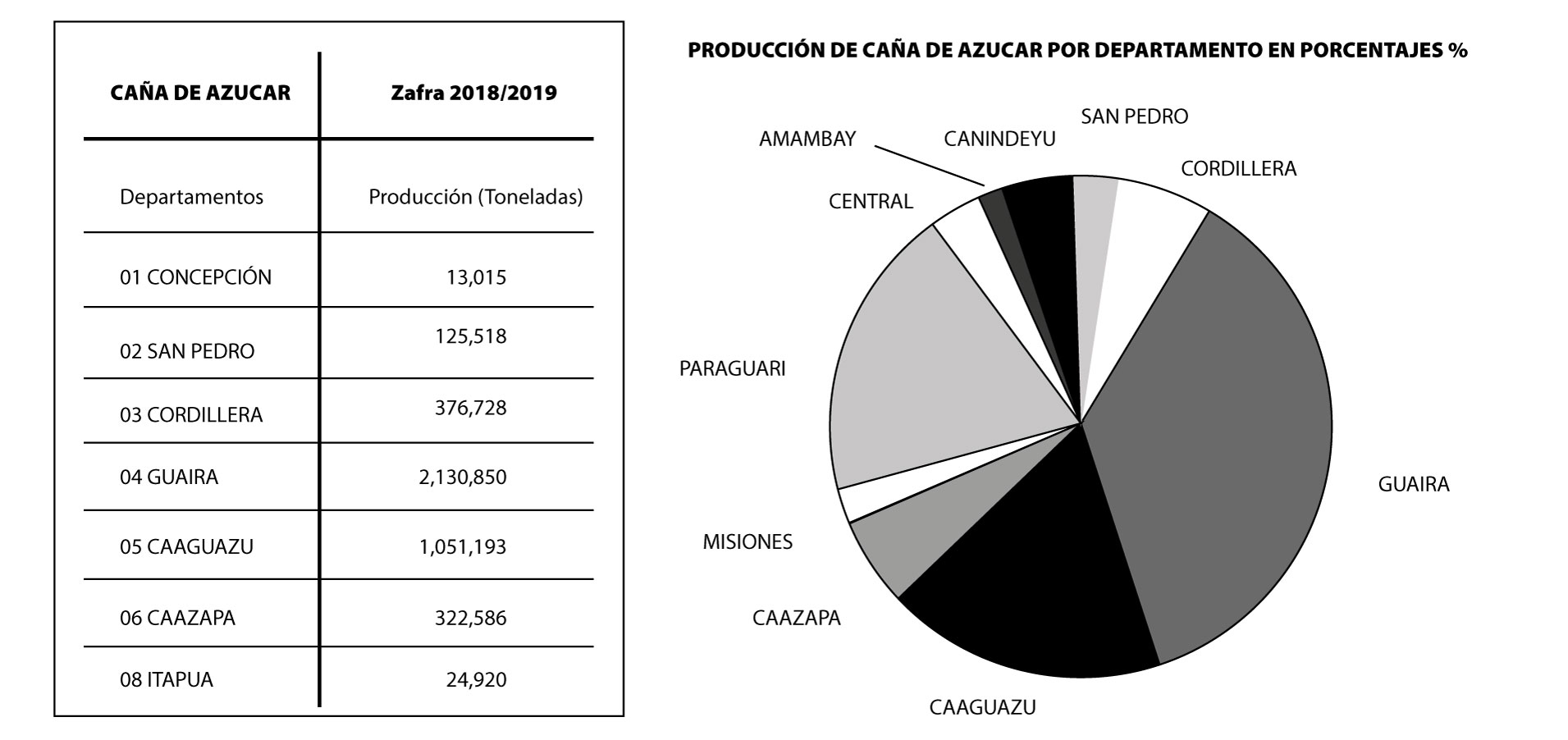 Producción de caña de azúcar concentrados en los departamentos de Guairá, Paraguarí y Caaguazú (77%) paraguaya.
